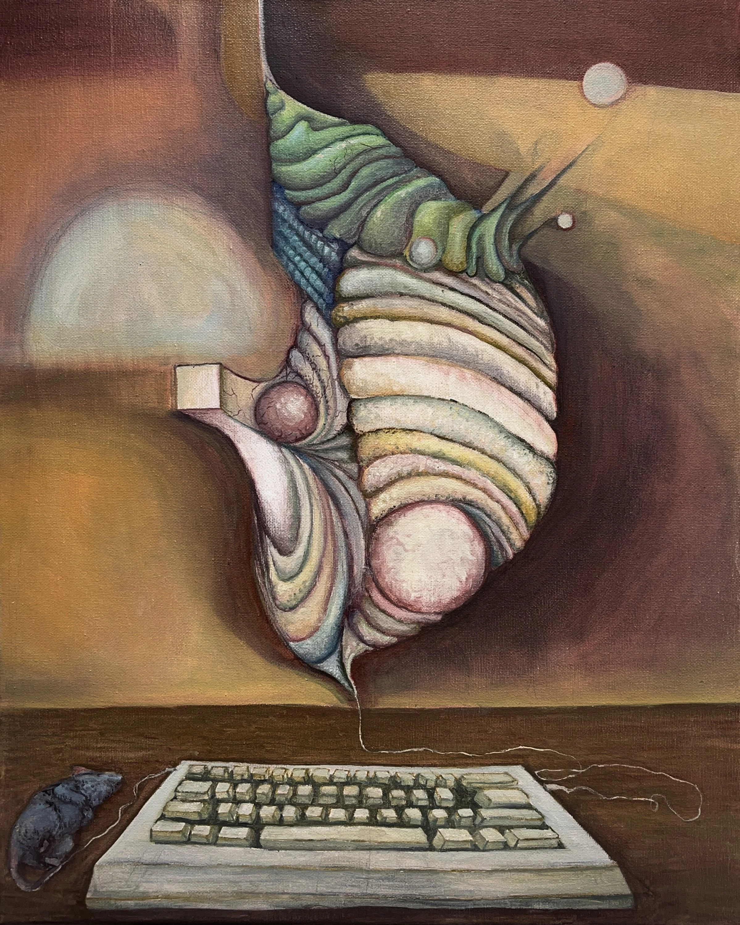 Two Dimensional Work The Hungry Computer Intertwined Unearthing Reality Drained Sleep Self Portrait Surreal Mindscape Surroundings of My Past Bouquet Untitled Quiet Moment The Long Road Lightning I Blinked Rooster Hello There Patiently Watching Humanity